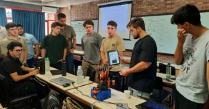 Facultad de Ingeniería 02/12/2025 Estudiantes de Mecatrónica presentaron proyectos de robótica Alumnos de la asignatura Robótica II presentaron los proyectos desarrollados durante el 2° semestre de cursado. Etiqueta: mecánica - automatización - ingeniería
