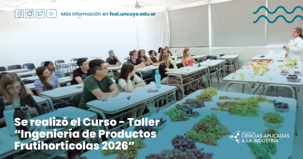 Como es tradicional en nuestra casa de altos estudios, del 2 al 6 de marzo se desarrolló el Curso – Taller "Ingeniería de Productos Frutihortícolas 2026", una propuesta académica orientada a profundizar en los aspectos ingenieriles y tecnológicos de los productos alimenticios característicos de la Provincia de Mendoza.