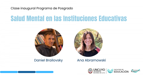 Los especialistas disertarán en la clase inaugural del programa "Salud Mental en las Instituciones Educativas" que ofrecen la Facultad de Educación de la UNCuyo y la Dirección de Acompañamiento Escolar (DAE) de la Dirección General de Escuelas de Mendoza. El encuentro será el jueves 12 de marzo, a las 19, en el aula 11 de la sede Campus de la Unidad Académica, con acceso libre. Se transmitirá por YouTube.